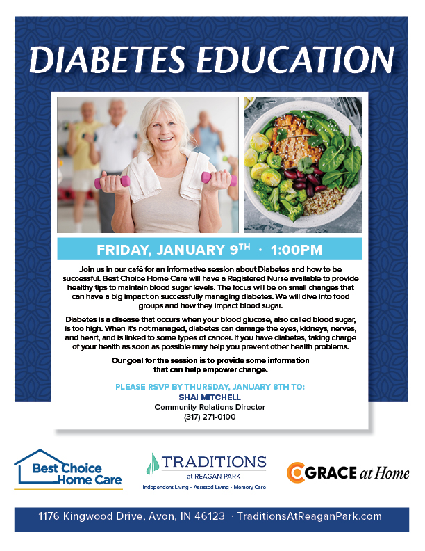 Join us in our café for an informative session about Diabetes and how to be successful. Best Choice Home Care will have a Registered Nurse available to provide healthy tips to maintain blood sugar levels. The focus will be on small changes that can have a big impact on successfully managing diabetes. We will dive into food groups and how they impact blood sugar.