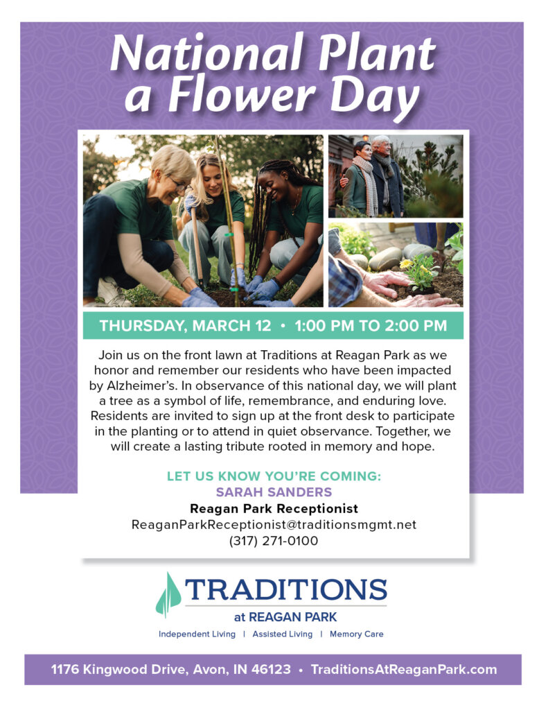 Join us on the front lawn at Traditions at Reagan Park as we honor and remember our residents who have been impacted by Alzheimer’s. In observance of this national day, we will plant a tree as a symbol of life, remembrance, and enduring love. Residents are invited to sign up at the front desk to participate in the planting or to attend in quiet observance. Together, we will create a lasting tribute rooted in memory and hope.