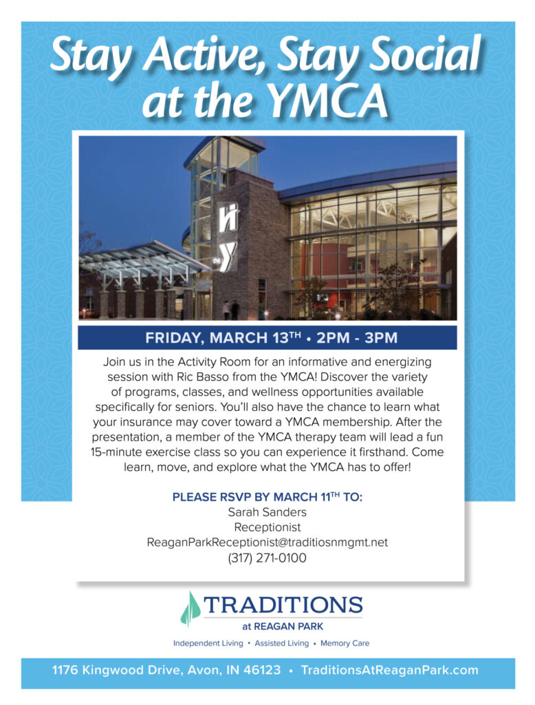 Join us in the Activity Room for an informative and energizing session with Ric Basso from the YMCA! Discover the variety of programs, classes, and wellness opportunities available specifically for seniors. You’ll also have the chance to learn what your insurance may cover toward a YMCA membership. After the presentation, a member of the YMCA therapy team will lead a fun 15-minute exercise class so you can experience it firsthand. Come learn, move, and explore what the YMCA has to offer!
